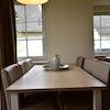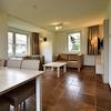 Das Wohnzimmer ist hell und gemütlich mit zwei Ledersofas, Couchtisch und TV-Möbel eingerichtet. Große Fenster auf drei Seiten sorgen für viel Tageslicht und Blick ins Grüne rund um das Haus. Der Esstisch mit sechs Stühlen steht an der Terrassentür, sodass Innen- und Außenbereich harmonisch ineinander übergehen. Der Fliesenboden ist pflegeleicht und ideal für ein Ferienhaus.