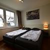 Schlafzimmer 1 befindet sich im Erdgeschoss und ist mit zwei Boxspringbetten eingerichtet, die als Doppelbett genutzt werden können. Das große Fenster bietet Blick auf den Park und viel Tageslicht. Ein Kleiderschrank und Wand-TV vervollständigen den Raum. Die Lage direkt neben dem Badezimmer im Erdgeschoss ist ideal für weniger mobile Gäste oder als Elternschlafzimmer.