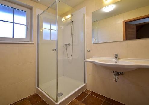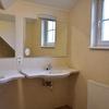 Badezimmer 1 en-suite, vollständig gefliest und mit einer großzügigen Duschkabine mit Glaswänden, Waschbecken und großem Spiegel ausgestattet. Das Fenster sorgt für Tageslicht und Belüftung. Die Kombination aus hellen Wandfliesen und braunen Bodenfliesen passt gut zum Stil des Erdgeschosses.
