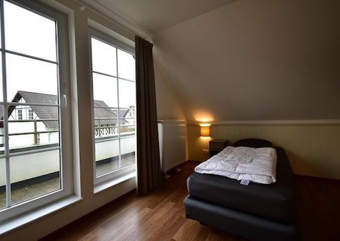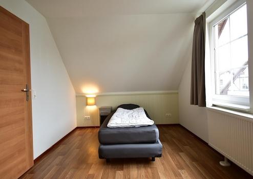 Schlafzimmer 3 verfügt ebenfalls über ein Einzel-Boxspringbett und grenzt an einen Balkon, der über große Terrassentüren erreichbar ist. Dadurch wirkt der Raum hell und großzügig. Der Balkon bietet Blick auf die umliegenden Ferienhäuser und das Grün der Anlage. Dieses Zimmer ist ideal für Gäste, die gerne einen eigenen Außenbereich am Schlafzimmer haben.