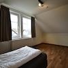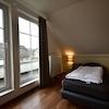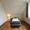 Schlafzimmer 2 im Obergeschoss verfügt über ein Einzel-Boxspringbett, Nachttisch und ein Fenster mit Blick auf den Park. Die Dachschräge verleiht dem Raum eine gemütliche Atmosphäre. Es gibt ausreichend Platz für einen zusätzlichen Schrank. Dieses Zimmer eignet sich gut als ruhiges Gäste- oder Kinderzimmer.