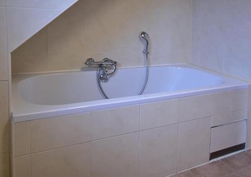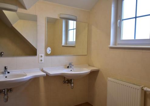 Badezimmer 2 im Obergeschoss bietet zusätzlichen Komfort mit Badewanne unter der Dachschräge und Doppelwaschbecken. Der breite Spiegel mit Beleuchtung macht den Raum hell und praktisch. Dieses Badezimmer ist ideal für Familien oder Gäste, die nach einem Tag in der Moselregion in der Wanne entspannen möchten.