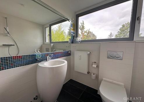 Die lichtdurchfluteten Räume profitieren von bodentiefer Panoramaverglasung und elektrischer Beschattung, inklusive Wind- und Sonnenwächter. Ein Kamin ist vorbereitet. Dieser kann in zwei Geschossen genutzt werden.