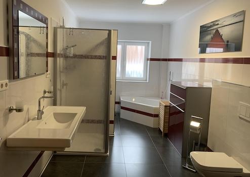 Vollbad: mit Dusche, Badewanne, Fenster und Wandheizkörper