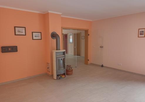 Wohnzimmer: mit 2 Doppelverandatüren zur Terrasse, Kaminofen, Fußboden gefliest