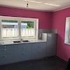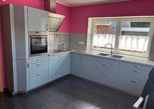 Küche: Einbauküche in L-Form, Melaminbeschichtung, mit Elektrogeräten von NEFF (Herd, Backofen und Geschirrspüler)