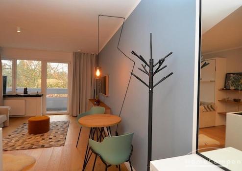 Die Wohnung verfügt über eine hochwertige weiße Einbau Küchenzeile mit Kühlschrank, Einbauherd, Kochfeld, Geschirrspüler großes Klappbett,Esstisch, schönes Sideboard, großer Kleiderschrank, offenes Regal, bequeme Couch. Es gibt einen sonnigen Balkon.