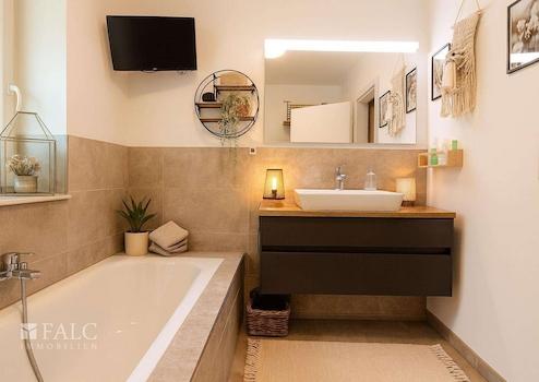 Wir gehen durch die Eingangstür und kommen über eine geflieste Treppe und einem Aluhandlauf nach oben in den ersten Bereich der wunderschönen Maisonetten-Wohnung. Gleich links öffnet sich das stilvolle Badezimmer, ausgestattet mit hochwertigen Möbeln, eingelassener Badewanne, offener Dusche, in Aluleisten eingefassten Fliesen, WC, Handtuchheizkörper und sogar einem Fernsehanschluss – eine kleine Wellnessoase zum Abschalten. Direkt daneben liegt ein kleines, vielseitiges Zimmer, das sich ganz nach Bedarf verwandeln kann – als ruhiger Arbeitsplatz, gemütliches Gästezimmer oder liebevoll gestaltetes Kinderzimmer. Ein Raum, der sich den Wünschen seiner Bewohner mühelos anpasst.