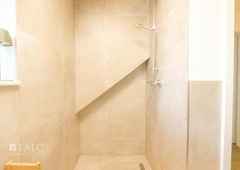 Über eine in Holzoptik geflieste Treppe, veredelt mit eingefassten Alu-Eckschienen, in die Wand integrierten Licht-Spots und einem Handlauf aus Alu, gelangen wir weiter in das Dachgeschoss. Dort empfängt uns ein zweites Badezimmer, dessen hochwertige Möbel, die barrierefreie Dusche und das moderne WC Funktionalität mit einem angenehmen Hauch von Wellness vereinen.