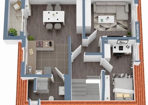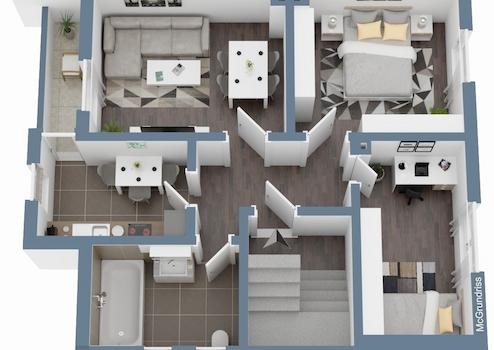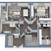 Das Haus bietet insgesamt ca. 200 m² Wohn-/ Nutzfläche, verteilt auf drei gut geschnittene Wohneinheiten. Im Erdgeschoss und Obergeschoss befinden sich jeweils 3-Zimmer-Wohnungen. Aktuell verfügt die Erdgeschosswohnung jedoch nur über zwei Zimmer, da durch das Entfernen einer Wand ein großzügig offen gestalteter Wohn-/ und Essbereich geschaffen wurde. Im Dachgeschoss befindet sich eine 2-Zimmer-Wohnung mit offenem Wohn-/ und Küchenbereich. Darüber hinaus steht im Dachgeschoss ein zusätzlich, separat gelegenes Arbeitszimmer zur Verfügung.