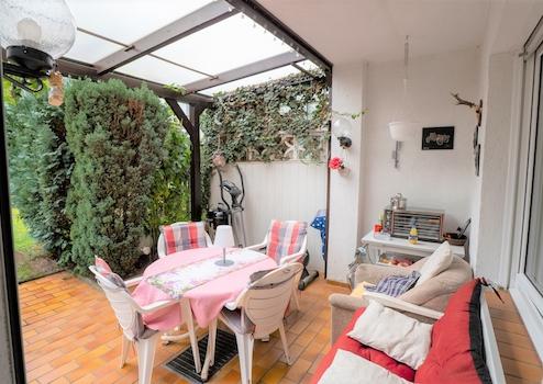 Die Erdgeschosswohnung verfügt über eine ca. 12,5 m² große, überdachte Terrasse mit anschließendem, direkt zugänglichem Garten. Dieser bietet mit seiner süd-ostorientierten Ausrichtung und einer umlaufenden Hecke ein hohes Maß an Privatsphäre.