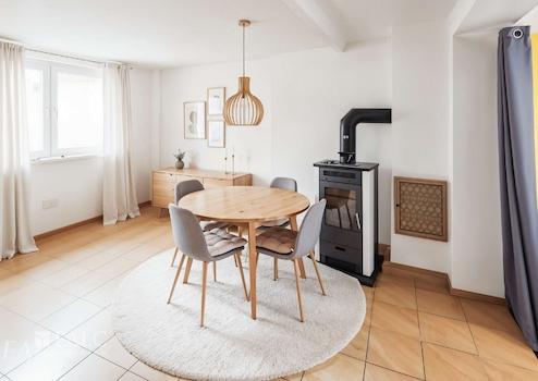 Das Wohnzimmer ist großzügig geschnitten und verfügt über einen Kamin, der an kühlen Abenden für Gemütlichkeit sorgt. Die angrenzende Küche mit Essbereich bietet ausreichend Platz für gemeinsame Mahlzeiten.