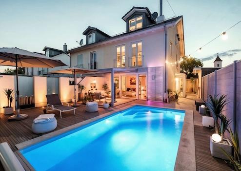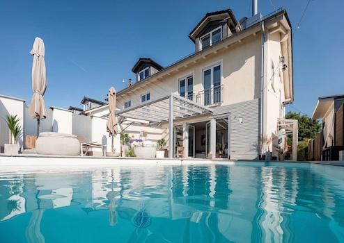 Der beheizbare Pool mit römischer Treppe und die stilvoll gestalteten Ruhebereiche verwandeln den Garten in eine private Resort-Landschaft – ein Statement für luxuriöses Wohnen.