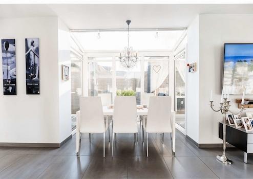 Auf ca. 162 m² und vier Ebenen entfaltet sich ein lichtdurchflutetes Ambiente mit großzügigen Räumen und edlen Materialien. Das Herzstück bildet der offene Wohn-/Essbereich mit raumhoher Fensterfront und eigenem Kamin; von hier führt der Weg direkt hinaus in den Garten zur sonnigen Lounge. Der stilvolle Outdoor-Bereich inszeniert lässig-elegantes Urlaubsflair und wird von einer separaten Gartenlounge ergänzt. Angeschlossen an den Wohn- und Essbereich präsentiert sich die hochwertige, offene Küche.