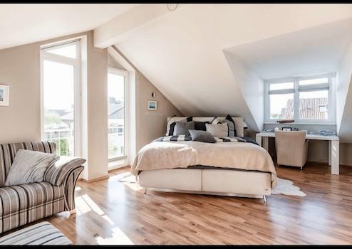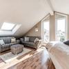 Im Dachgeschoss entsteht Ihr privater Rückzugsort: das Master-Schlafzimmer mit Platz für eine Sitz- oder Leseecke und Raum für individuelles Design. Die hohen Fensterflächen bringen reichlich Tageslicht ins Zimmer.