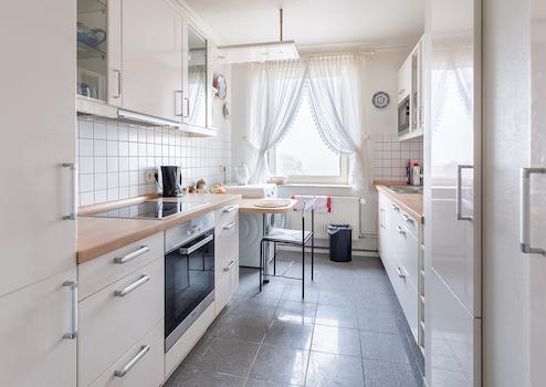 Im hellen Dekor präsentiert sich die funktionelle Einbauküche, die mit ausreichend Ober- und Unterschränken und den notwendigen Elektrogeräten ausgestattet ist. Platz für eine kleine Frühstücksecke ist hier ebenfalls noch vorhanden.
