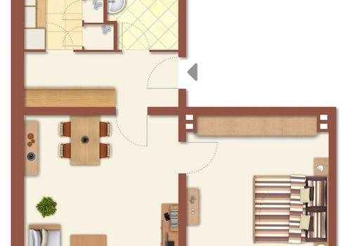 Das direkt vom Wohnzimmer begehbare Schlafzimmer bietet Ihnen vielfältige Stellflächen für einen großen Kleiderschrank und ein Doppelbett.