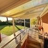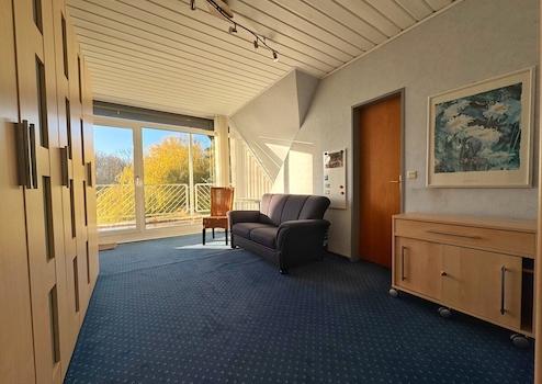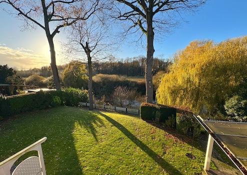 Der eingeschossige Anbau aus dem Jahr 1983 erweitert das Raumangebot mit einer zusätzlichen Wohneinheit im Erdgeschoss. Hier finden Sie ein stilvolles Schlafzimmer, einen kombinierten Wohn- und Essbereich, eine Küche und ein Badezimmer. Auch hier gibt es eine Terrasse mit wunderschönem und unverbaubarem Blick über die Ems.