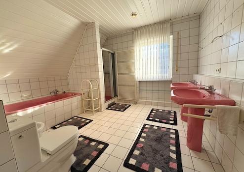 Die Immobilie verfügt somit insgesamt über sieben Zimmer, darunter vier Schlafzimmer und drei Badezimmer, was es ideal für Familien oder als Mehrgenerationenhaus macht. Der liebevoll gestaltete Garten mit direktem Zugang zur Ems, die Terrasse und die Loggia bieten vielfältige Möglichkeiten zum Entspannen und Genießen der umliegenden Natur. Das Haus ist voll unterkellert und bietet eine Garage für zusätzlichen Stauraum. Insgesamt wurden in den letzten 15 Jahren bereits energetische Maßnahmen getroffen, u.a. Dämmung des Daches, Erneuerung der Heizung und Erneuerung vieler Fenster.