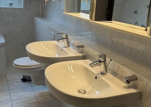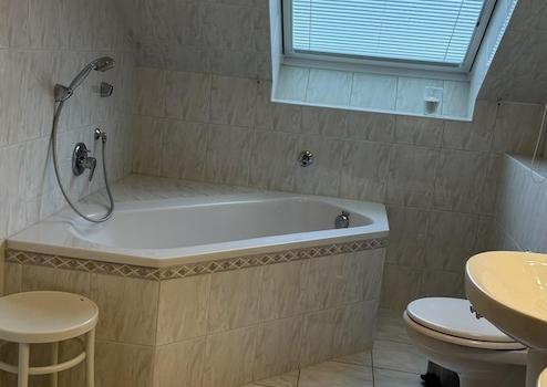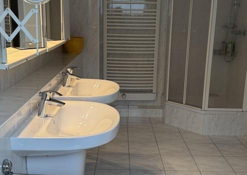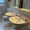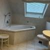 Großzügiges Tageslichtbad: komfortable Eckbadewanne und Dusche, Doppel-waschtische, helle, zeitlose Fliesen