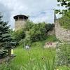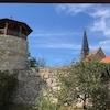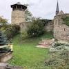 Wunderschöner Garten mit Terrasse und Blick auf historische Stadtmauer.