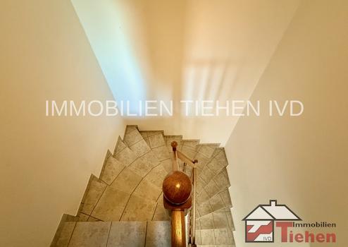 Eine robuste, geflieste Stahlbetontreppe mit massivem Eichengeländer führt ins Dachgeschoss.