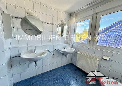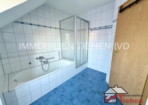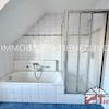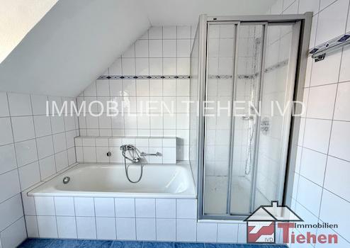 Das helle Tageslichtbad im DG bietet dank zweier Fenster eine freundliche Atmosphäre und ist mit weißen Wandfliesen zeitlos gestaltet. Es verfügt über eine Badewanne, eine separate Dusche, ein Waschbecken und ein WC. Die sanitäre Ausstattung ist gepflegt, funktional angeordnet und bietet ausreichend Platz. Durch die leichte Dachschräge wirkt der Raum gemütlich, ohne an Nutzbarkeit einzubüßen.