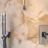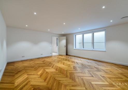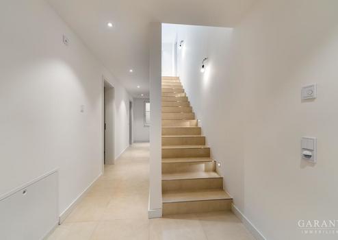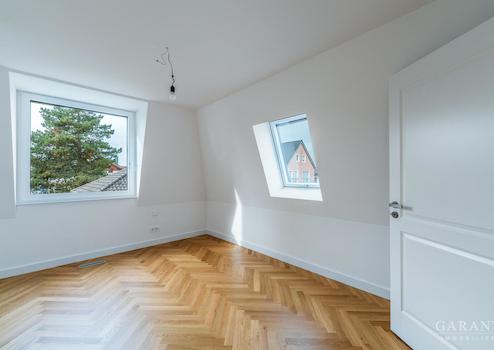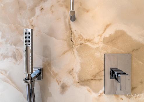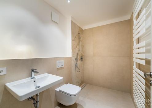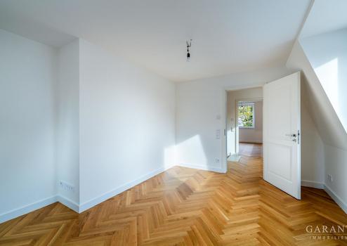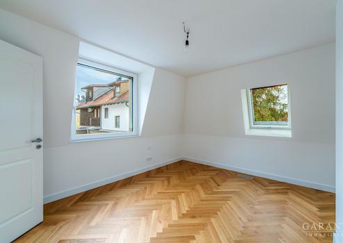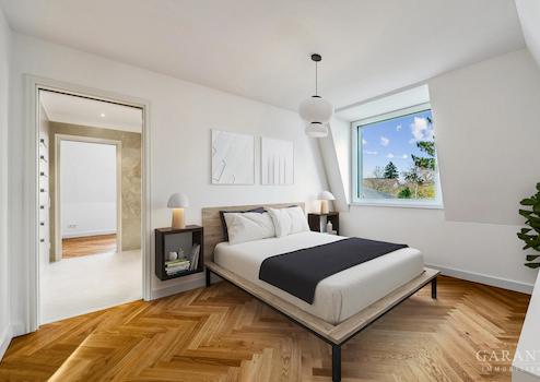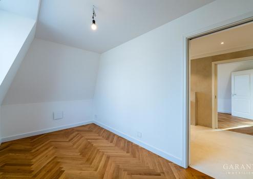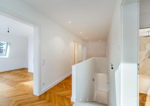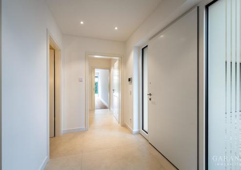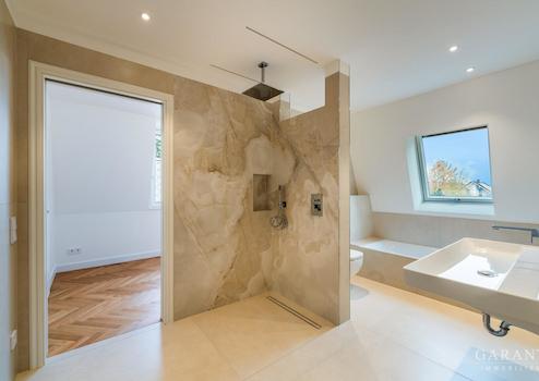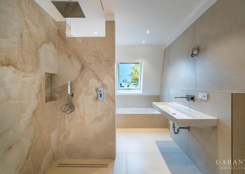 Im Obergeschoss erwartet Sie ein Ensemble aus Schlafzimmer, Ankleidezimmer und luxuriösem Bad, das mit zwei eleganten Schiebetüren verbunden ist. Das Masterbad beeindruckt mit einer großzügigen Walk-In-Dusche und einer Badewanne mit Blick in den Himmel, Doppelwaschbecken sowie Armaturen von Gessi und ein Handtuchhalter von Vola. Fein geäderte, am Onyx inspirierte Dekorfliesen schaffen eine Atmosphäre von Ruhe und Exklusivität. Zwei weitere Zimmer und ein Bad mit Walk-In-Dusche bieten stilvollen Komfort für Familie und Gäste.