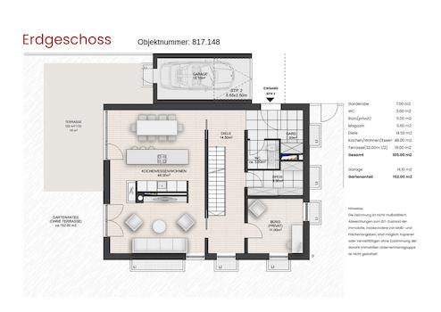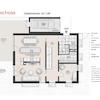 Das Herzstück des Hauses bildet der großzügige Wohn- und Essbereich mit Platz für eine offene Küche und frei stehendem Küchenblock. Große Fensterfronten mit Schiebetüren führen auf die sonnige Terrasse mit Süd-West-Ausrichtung - Ein Ort, an dem sich Alltag und Erholung vereinen.