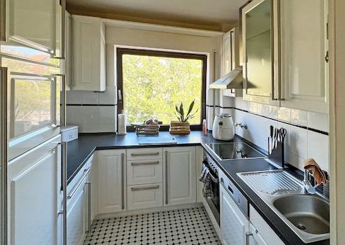 Derzeit ist das Badezimmer als Duschbad und Stellfläche für Waschmaschine und Trockner gestaltet. Die Größe lässt jedoch auch die Installation einer Badewanne zu. Die Küche ist modern und zeitlos gehalten und zusammen mit den Markengeräten (Ofen, Herd und Geschirrspüler) für die nächsten Jahre noch erstklassig nutzbar.