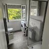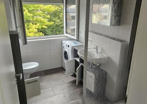 Modernes, komplett gefliestes und möbliertes Badezimmer