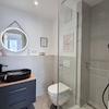 Die Echtglas-Duschwand und der runde, beleuchtete Spiegel erzeugen exklusive Atmosphäre.