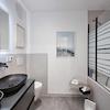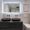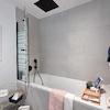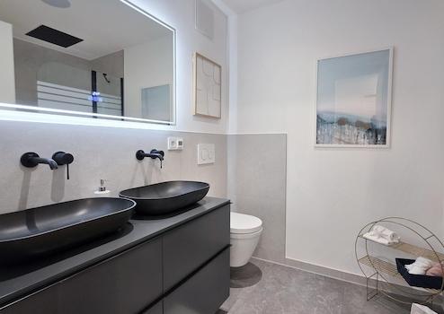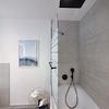 Dieses Design-Badezimmer verbindet modernen Wohnkomfort mit exklusiver Ausstattung. Unterputz-Regendusche und Armaturen im "Black Design" und die großzügige Waschschale setzen einen stilvollen Akzent und verleihen dem Raum eine außergewöhnliche Note.