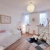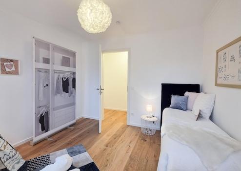 Ein großzügiger Schlafbereich, ein Spielebereich und auch ein Kleiderschrank finden hier platz . Viel Tageslicht bringen die beiden Fenster in den Raum und machen ihn besonders attraktiv für die ganztägige Nutzung.