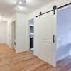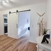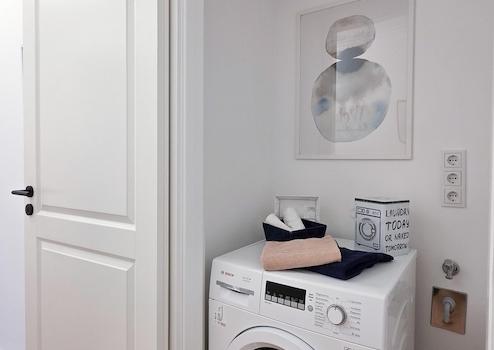 Der Hauswirtschaftsraum mit platz für Waschmaschine, Trockner und einem Regalbereich. Die Kassettentüre bietet optisch- und akustische Abgrenzung.