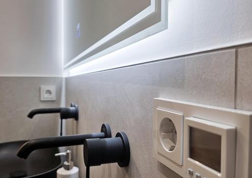 Die großzügige Badewanne mit hochwertigen Unterputzarmaturen von Grohe elegante Rainshower-Deckendusche, Wandheizkörper im modernen „Black-Design“, Doppelwaschtisch, geschmackvolle Wandarmaturen, Softclose-Unterschrank, LED Badspiegel sowie Bluetooth-Lautsprecher lassen dieses Bad zur Wellness-Oase werden. Eine elektr. Fußbodenheizung unterstützt das Wohlbefinden.