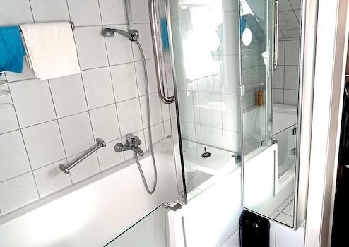 Über eine offene Holztreppe gelangen Sie in die erste Etage, Dort befindet sich das attraktive Badezimmer mit begehbarer Badewanne, einem integriertem Duschbereich sowie Waschbecken und Bidet.