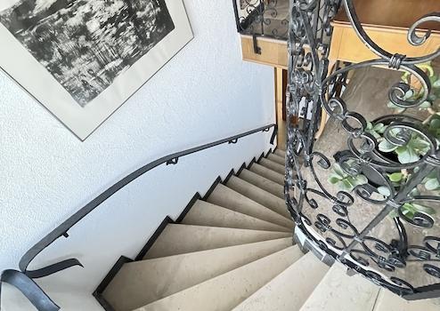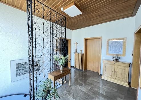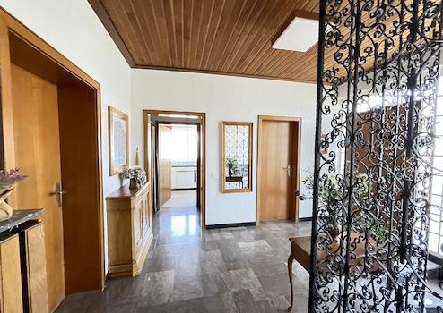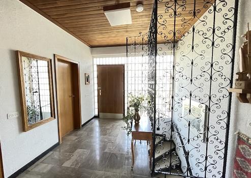 Durch den hübsch bepflanzten Vorgarten erreicht man, über eine ebene, gepflasterte Zuwegung, die Treppe zum Hauseingang (nur 5 Stufen). Schon beim Betreten des Hauses ist man erstaunt, über die äußerst großzügige Diele, von der aus alle Zimmer des Erdgeschosses erreichbar sind. Ein repräsentatives Entrée zum Empfangen von Gästen und viel Platz zur Unterbringung von Garderobe, Schuhe & Co. Die Glasbausteine neben der Hauseingangstür sorgen für einen guten Lichteinfall, alles wirkt hell + freundlich. Die edlen Marmorfliesen und die schmiedeeisernen Elemente entlang des Treppenauges sind ein wahrer Blickfang...!