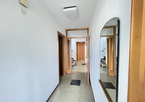 Neben der inneren (derzeit offenen) Verbindung über das Treppenhaus, verfügt diese Wohnung auch über einen ebenerdigen, separaten Eingang auf der rechten Giebelseite des Hauses.