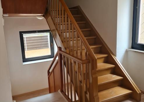 Die einzelnen Geschosse sind durch Flure über eine geschlossene Holztreppe miteinander verbunden. Die Aufteilung bietet auch einer Familie mit Kindern oder Eltern ausreichend Platz zum angenehmen Wohnen und Wohlfühlen.