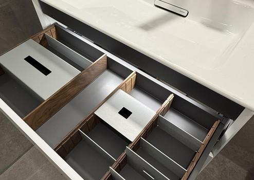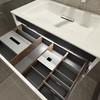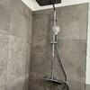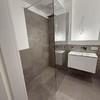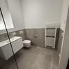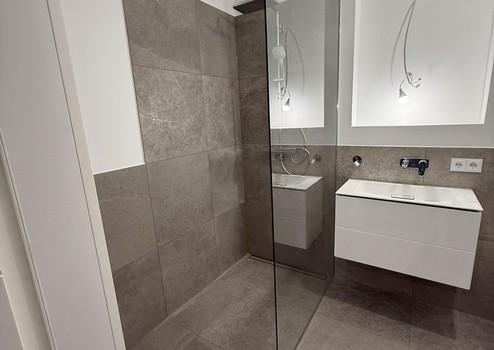 Duschbad mit großformatigen edlen Fliesen und ebenerdiger Ganzglasdusche, edler Geberit Waschtisch mit Unterschrank sowie ein beleuchteter Spiegelschrank (wird noch montiert)