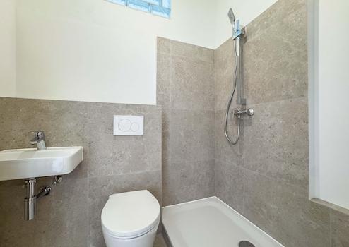 Badezimmer mit Dusche. Der Flur führt Sie weiter in das