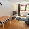 Ein kleiner Esstisch steht ebenfalls bereit. Vom gemütlichen Sofa hat man einen schönen Ausblick in den Garten oder zum Smart-TV mit Kabelanschluss.