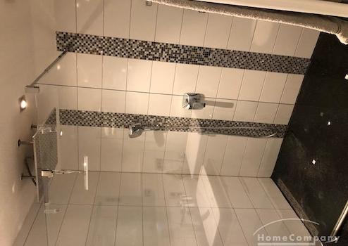 Bad mit großer, bodentiefer Dusche und Wasch-Trocken-Kombination.