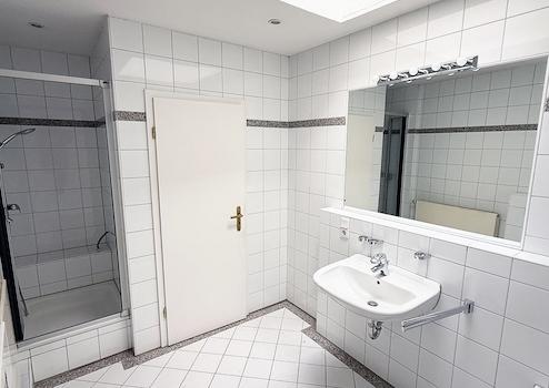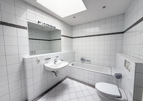 Im Obergeschoss befinden sich ein großzügiges Schlafzimmer mit praktischer Nische (ideal als Ankleide oder Homeoffice) sowie ein geräumiges Badezimmer mit Wanne und Dusche und ein Abstellraum. Das Treppenhaus und das Bad werden durch Dachluken-Fenster angenehm mit Tageslicht versorgt.