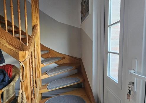 Die Böden sind unten komplett mit Vinyl verlegt, welches vollflächig verklebt wurde. Das kleine Gästebad unten ist komplett renoviert worden. Ein Wandhängendes Klo wurde montiert.