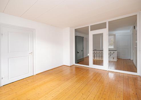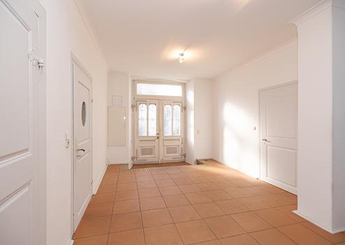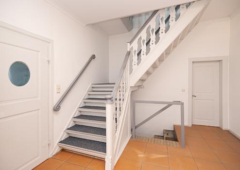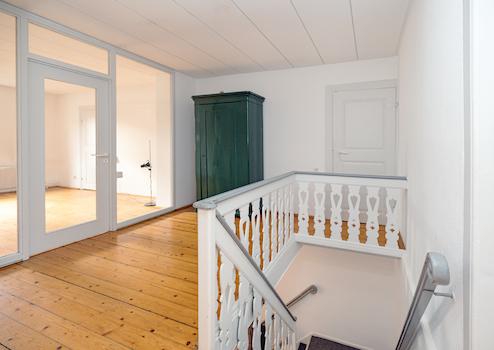 Der linke Gebäudeteil, einst als Notariat genutzt, umfasst rund 197 m² auf zwei Etagen. Eine repräsentative Steintreppe führt in das historische Entrée, während eine kunstvoll verzierte, denkmalgeschützte Holztreppe ins Obergeschoss verbindet. Zusätzlich steht im Dachgeschoss ein großer Archivraum bereit – ideal für Lager, Atelier oder ruhiges Arbeiten.