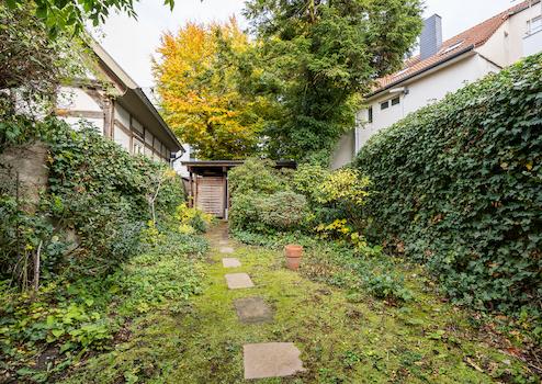 Durch eine große Schiebetür im Wohnbereich gelangt man in den verwunschenen Garten, der sich trotz Innenstadtlage unerwartet ruhig und geschützt zeigt. Ein Carport mit elektrischem Rolltor sowie zusätzlichem Stauraum ist über eine Seitenstraße erreichbar, vier weitere Stellplätze befinden sich vor dem Haus.