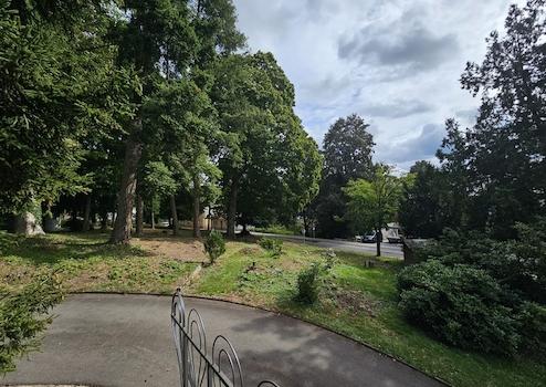 Das Baugrundstück ist Teil eines größeren Parkgeländes mit altem Baumbestand. Die bereits in einzelne Flurstücke aufgeteilte Fläche von ca. 896 m² bietet reichlich Platz für individuelle Bauvorhaben. Die nähere Umgebung ist geprägt von schönen alten Villengrundstücken mit herrschaftlichen Gartenanlagen. Eine Sandsteinmauer begrenzt das Grundstück zur Straße hin. Die Zufahrt erfolgt über eine Privatstraße, die ein weiteres Villengrundstück erschließt.