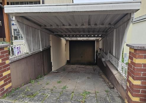 Die Einzelgarage ist zusammen mit dem Hauptgebäude im Jahr 1960 errichtet worden. Das Flachdach der Garage wird als Terrasse, erweitert durch einen großen Balkon, vom Erdgeschoss aus genutzt. Es ergibt sich ein herrilcher Blick auf das Grundstück und auf einen Teil von Siegelbach. Der vorgebaute Carport wurde später errichtet.